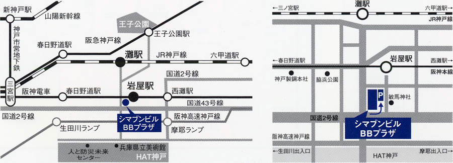 ●JR:灘駅より南へ徒歩約10分 ●阪神:岩屋駅改札を出てすぐ南側 ●新幹線:新神戸駅よりタクシーで約15分